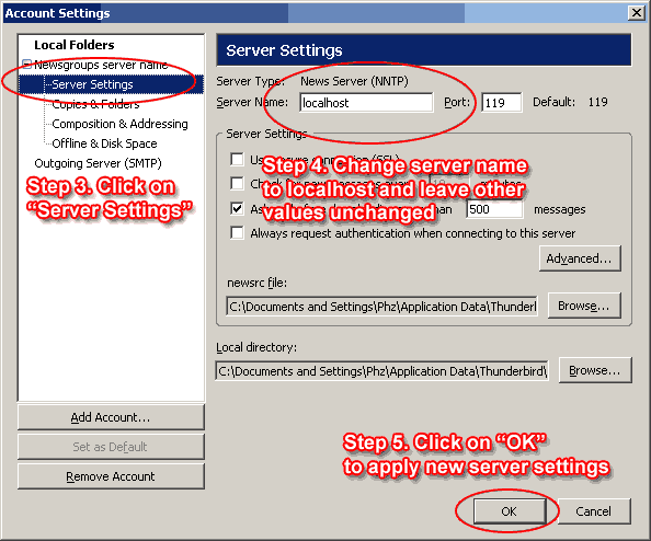 (Configuration part 2 of 2) - Configuring Mozilla Thunderbird to work with yDecodeIf you are using Mozilla Thunderbird instead of Outlook Express first configure yDecode just like described above. Note that Test Config button will not be able to detect if you properly configured Mozilla Thunderbird. However, server connection will be tested successfully. Regardless of inability to check account settings for Mozilla Thunderbird, yDecode will still work with it as well as with any other news reader. |
