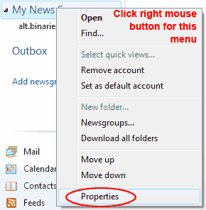 QuickstartyDecode can auto-configure itself - simply answer "Yes" to the question that asks you to automatically configure yDecode after you start yDecode the very first time. If you answer "No" you can still start automatic configuration wizard later by clicking on Auto-Config button in yDecode. (Configuration part 1 of 2) - Configuring yDecodeSTEP 1 - Enter your server (and optionally port and SSL)Enter your news server name into the NNTP Server Name box. In this example (screenshot below) we have news.yourhost.com - but this is only an example - you should replace this with your actual Usenet server name that you use. Also look at servers tab section of this help for more info. Don't modify other settings if unsure - 119 for both port values (see screenshot) and SSL box unchecked is fine most of the time. STEP 2 - Test configurationMake sure that your firewall is not blocking yDecode. Now you can test the connection to the server as well as news account configuration by pressing the Test Config button - you should get a window showing messages similar to these: (Configuration part 2 of 2) - Configuring Outlook Express / Windows Mail / Windows Live Mail to work with yDecodeSTEP 1 - Getting into server propertiesAssuming that you already have configured newsgroup account that works with your newsgroup server, you need to make a little adjustment to make it work with yDecode. To do so first click on your account name using the right mouse button to get a menu just like on the screenshot below and then select option properties.