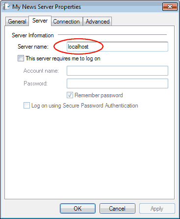 STEP 2 - Changing server name to localhostNow you will get to a window similar to the one below. Replace your server name with localhost just like on the screenshot below. Remember - it's not local host (two words) but one word - localhost. It must be exactly like this. This will redirect Outlook Express from your news server to yDecode (yDecode is in fact a server). The server name that used to be here should be now in yDecode NNTP server name box.